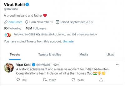 टिम इंडियाचा माजी कर्णधार विराट कोहली आणि बॉलिवूड अभिनेता रितेश देशमुखनेही या ऐतिहासिक विजयाबद्दल टिमचं अभिनंदन केलं. तसेच, भारतीय बॅडमिंटन टिमने इतिहास रचल्याचं म्हटलं आहे.