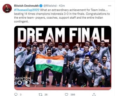 14 वेळा चॅम्पियन राहिलेल्या इंडोनेशियाच्या संघाला पराभूत करुन टीम इंडियाने ऐतिहासिक विजय मिळवला, या विजयाबद्दल बॅडमिंटन संघाचे अभिनंदन असे ट्विट रितेश देशमुखने केले आहे.