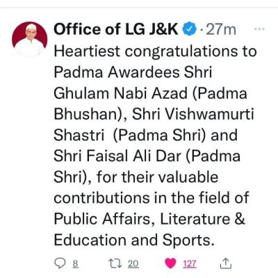 क्रीडा जगतातून फैजल अली दारची पद्मश्री पुरस्कारासाठी निवड झाली. पुरस्काराची घोषणा झाल्यावर जम्मू-काश्मीरच्या नायब राज्यपालांनीही ट्विट करून त्याचे अभिनंदन केले.