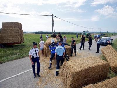 शेतक-यांनी मार्गात टाकलेल्या पेंढ्यांतून सायकलस्वारांना मार्ग काढावा लागला. 187 किलोमीटरच्या या प्रवासात प्रथमच शर्यतीला गालबोट लागले.