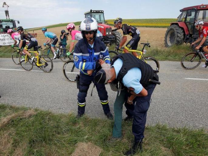 1 / 5टूर दी फ्रान्स शर्यतीच्या 16व्या टप्प्यात आंदोलकांची टूर पाहायला मिळाली. काही स्थानिक शेतक-यांनी शर्यतपटूंच्या मार्गात अडथळा निर्माण करण्याचा प्रयत्न केला. त्यावेळी या आंदोलकांना रोखण्यासाठी पोलिसांना स्प्रेचा वापर करावा लागला.2 / 5शेतक-यांनी मार्गात टाकलेल्या पेंढ्यांतून सायकलस्वारांना मार्ग काढावा लागला. 187 किलोमीटरच्या या प्रवासात प्रथमच शर्यतीला गालबोट लागले. 3 / 5स्पर्धेत व्यत्यय आणणा-या आंदोलकांना पोलीस पकडून बाहेर करत होते. 4 / 5शेतक-यांनी मार्गावर टाकलेल्या पेंढ्याचे गठ्ठे पोलिसांनाच हटवावे लागले. 1984नंतर प्रथमच या मार्गावर आंदोलकांनी ही शर्यत अडवल्याची घटना घडली.5 / 5ही शर्यत रोखण्यासाठी आंदोलकांनी मार्गावर मेंढ्यांचा कळप सोडला. त्यांनाही हटवण्यासाठी पोलिसांना प्रयत्न करावे लागले.