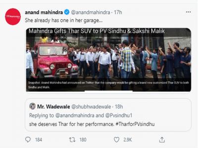 ट्विटर यूजर वाडेवाले यांनी पी व्ही सिंधूसाठी ही मागणी केली. सिंधूला थार गाडी देऊन महिंद्रांनी सन्मानित करावे, असे म्हटले.