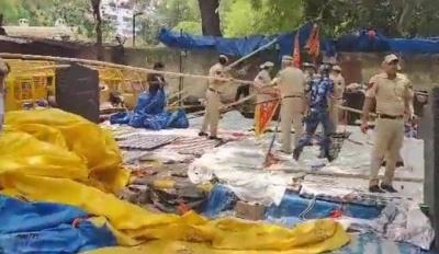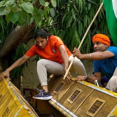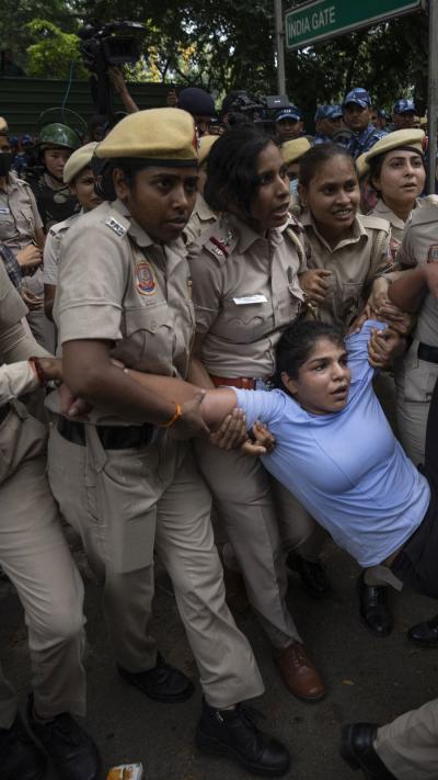 नवनिर्वाचित संसद भवनासमोर 'महिला महापंचायत' करण्याता इरादा असलेल्या पैलवांनाना दिल्ली पोलिसांनी ताब्यात घेतले. दिल्ली पोलिसांचा कडेकोड बंदोबस्त असताना देखील आंदोलकांनी बॅरिकेट्स काढून संसद भवनाकडे कूच करण्याचा प्रयत्न केला.