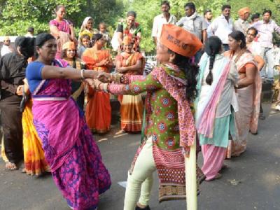 भाजपाच्या यशानंतर फुगडी घालत जल्लोष करणारे कार्यकर्ते.