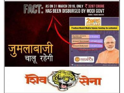 प्रधानमंत्री मुद्रा योजनेअंतर्गत सरकारने १.४१ लाख कोटी रुपये वितरित केल्याचा दावा केला. पण ही रक्कम अवघी ३२८७ कोटी असल्याचे सांगत शिवसेनेने हाही एक जुमलाच असल्याची टीका केली.