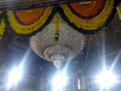 मंदिरातील झुंबर तसेच फुलांची सजावट भाविकांचे लक्ष वेधून घेत हाेते