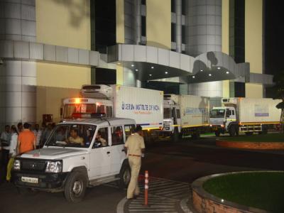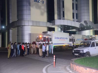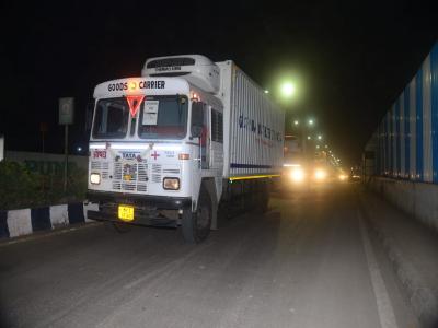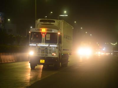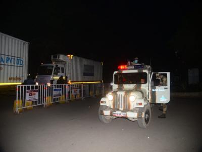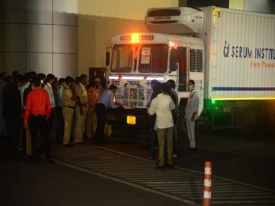 सिरमची 'कोविशिल्ड' लस घेऊन जाणारे कंटेनर बाहेर येण्याच्या प्रतीक्षेत..( सर्व छायाचित्रे : तन्मय ठोंबरे )