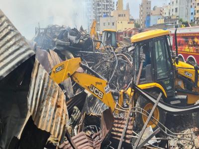 आगीत नुकसान झालेले पत्रे, भंगारातील वस्तू बाजूला घेताना जेसीबी