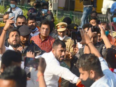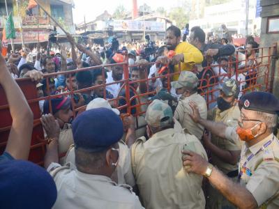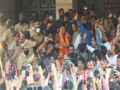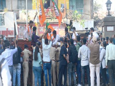 पुणे : किरीट सोमय्यांचा विजय असो, किरीट भाईंचा विजय असो, अशा जयघोषात पुणे महानगरपालिकेच्या प्रवेशद्वारावर भाजपच्या वतीने किरीट सोमय्याचे जंगी स्वागत करण्यात आले. पुणे पोलिसांची परवानगी नसतानाही भाजपच्या कार्यकर्त्यांनी धुडगूस घातली. त्यामुळे प्रवेशद्वारावरून पोलिसांना हटण्यास भाग पाडले. महापालिका परिसरात अत्यंत गर्दी झाली होती. भाजपच्या कार्यकर्त्यांबरोबरच असंख्य नागरिकही उपस्थित होते. भाजपचे कार्यकर्ते आक्रमक झाल्याचे चित्र यावेळी दिसून आले. गेटवर मोठ्या प्रमाणात गोंधळ झाला होता. त्यावेळी पोलिसांना कार्यकर्त्यांना आवरता आले नाही. ( सर्व छायचित्रे - तन्मय ठोंबरे )