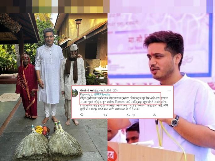 1 / 10राष्ट्रवादी काँग्रेसचे नेते आणि कर्जत-जामखेड मतदारसंघाचे आमदार रोहित पवार सोशल मीडियावर कायम सक्रीय असतात. आपल्या दैनंदीन घडामोडींची माहिती ते या अकाऊंटवरुन देतात. 2 / 10अनेकदा रोहित पवार हे विरोधकांवर टीका करण्यासाठीही सोशल मीडियाचा वापर करतात. सोशल मीडियातून सत्ताधारी गटांच्या चुका दाखवत त्यांच्यावर टीका करत असतात. तसेच, मतदारसंघातील कामांसाठी कुणा मंत्र्यांची भेट घेतल्यावरही फोटो ट्विट करतात. 3 / 10आपल्या मतदारसंघातील सलूनवाला, चहावाला किंवा इतराही सर्वसामान्या दुकानदारांकडे जाऊन ते सहजता दाखवात. याचे फोटोही ट्विटरवरुन शेअर करत असतात. आपल्यातील संवेदनशील राजकारणी दाखवण्याचा त्यांचा प्रयत्न असतो. 4 / 10रोहित पवार यांनी नुकतेच लक्ष्मी पूजनच्यादिवशी सोशल मीडिया अकाऊंटवरुन एक फोटो शेअर केला. त्यामध्ये, त्यांच्या घरी गेल्या अनेक वर्षांपासून लक्ष्मी पूजनासाठी केरसुणी देणाऱ्या दाम्पत्याची ओळख आहे. मात्र, या फोटोवरुन रोहित पवार चांगलेच ट्रोल झाले आहेत. 5 / 10माझ्या जन्मापूर्वीपासून दरवर्षी दिवाळीला लक्ष्मीपूजनासाठी लागणारी केरसुणी काटेवाडी (बारामती) येथील ज्ञानदेव भिसे (सावळा) आणि त्यांच्या पत्नी यांनी न चुकता यंदाही घरी आणून दिली. यावेळी या प्रामाणिक आणि कष्टाळू दांपत्याला दिवाळीच्या शुभेच्छा दिल्या.6 / 10रोहित पवार यांनी चांगल्या भावनेनं हा फोटो सोशल मीडियावर शेअर केला आहे. मात्र, या फोटोतील संबंधित दाम्पत्याची अवस्था पाहून नेटीझन्सने आमदार पवार यांना ट्रोल केलं आहे. तसेच, काहींनी रोहित पवारांच्या हाताकडे बोट दाखवतही प्रश्न विचारले आहेत. 7 / 10अनेक वर्षांपासून तुमच्या घरची सेवा करणाऱ्या या दाम्पत्यासाठी तुम्ही काय केलं, या दाम्पत्याची सेवा करा. केवळ कोरड्या शुभेच्छा देऊ नका, अशा शब्दात नेटीझन्सने त्यांच्या ट्विटर आणि फेसबुकवर कमेंट केल्या आहेत. 8 / 10 रोहित तुम्ही सतत इमोशनल पोस्ट करून तुम्हाला लोकांबद्दल खूप प्रेम आहे असं दाखवत असता, नुसते फोटो टाकून लाईक्स मिळवण्यासाठी आणि दादा खूप चांगले आहेत त्यांना किती कणव आहे हे दाखवण्यासाठी आपण असं करता हे वेळोवेळी सिद्ध झालं आहे.आज तुम्ही यांना भरपूर मदत करा आणि काय मदत केली हे टाका, असेही एकाने म्हटले आहे. 9 / 10दादा तुमच्या जन्मापूर्वीपासून हे दांपत्या आपल्याला केरसुणी आणून देता तरी त्यांची परिस्थिती तशीच आहे का,आज तुम्ही त्यांची दिवाळी समृद्ध केल्याचा फोटो टाकला असता तर तो जास्त भावाला असता, असेही एकाने सुनावले आहे. 10 / 10एकंदरीत रोहित पवार यांच्या या फोटोवर युजर्संने रिप्लाय देताना त्यांना चांगलंच ट्रोल केलं आहे. तसेच, वयोवृद्ध व्यक्तीच्या खांद्यावर हात ठेवणे कितपत योग्य, असाही सवाल विचारला आ