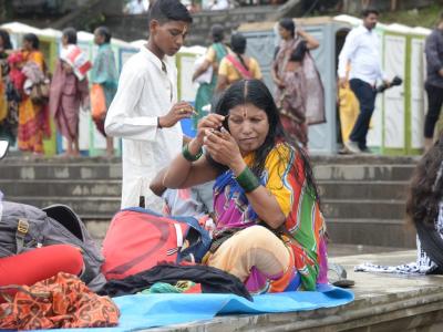 महिला वारकरी प्रस्थान सोहळ्यात सहभागी होण्यासाठी तयारी करताना