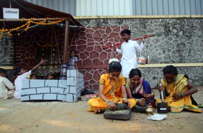 चावडीवर दोघा भावांतील तंटा सोडवणारे पंच, गावाला जागे करणारे वासुदेव, विहीर व हातपंपावर पाणी भरणाऱ्या बाया, कावडीतून पाणी वाहून नेणारे पुरुष, टुमदार घरे, बारा बलुतेदार, हिरवीगार शेती, गावाचा बाजार, जत्रा आणि बैलगाडी अवतरली थेट भांडारकर रस्त्यावरील डेक्कन जिमखान्याच्या 'बाशिम' गावात! (फोटो- आशिष काळे)