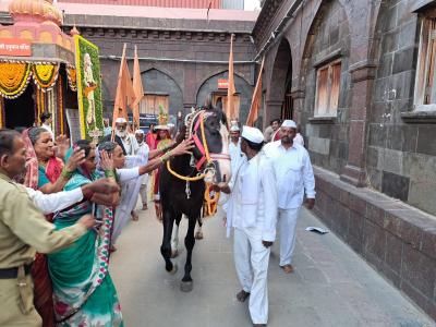 पालखीसोबत चालणारा मानाचा माई दिंडी बाबुळगावकरांचा अश्व चिखली मुक्कामावून सकाळी सात वाजता मंदिराच्या आवारात प्रदक्षिणा करण्यासाठी आला होता आश्वाससोबत पालखी सोहळ्यात चालणारी माई दिंडी देखील प्रदक्षिणा करण्यासाठी आली होती