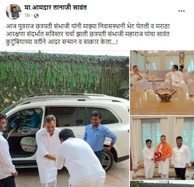 सावंत याच्या पुण्यातील कात्रज येथील घरी आज खासदार छत्रपती संभाजीराजे भोसले यांनी सदिच्छा भेट दिली. या दोन्ही नेत्यांमध्ये गेल्या काही दिवसांपासून चर्चा सुरू आहे.