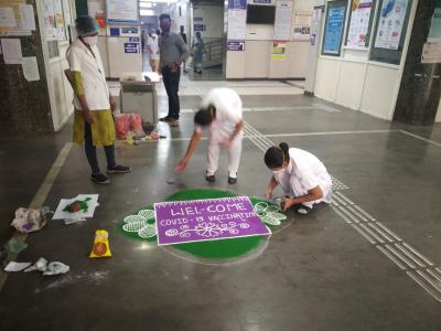 पुण्यातील हॉस्पिटलमध्ये डॉक्टर, नर्सेस यांनी लसीकरणाला सुरुवात करण्याअगोदर रुग्णालय परिसरात काढलेली नयनरम्य रांगोळी (छायाचित्रे : तन्मय ठोंबरे आणि पुणे लोकमत टीम)