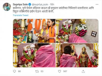विशेष म्हणजे राष्ट्रवादीच्या नेत्या खासदार सुप्रिया सुळे यांनीही पुण्यातील कर्व्हे नगरच्या हनुमान मंदिरात आरती केल्याचे फोटो ट्विटरवरुन शेअर केले आहेत.