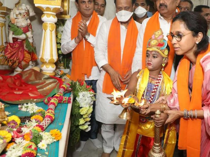 1 / 8मनसेप्रमुख राज ठाकरे यांनी मशिंदींवरील भोंग्याचा मुद्दा उचलून धरल्यानंतर हनुमान जयंतीच्यानिमित्ताने पुन्हा एकदा राजकीय वातावरण तापल्याचे दिसून आले. 2 / 8हनुमान जयंतीच्या निमित्ताने मनसेकडून पुण्यात महाआरतीचं आयोजन करण्यात आलं होतं. तर, शिवसेनेकडून दादरमध्ये अशीच महाआरती पार पडली. 3 / 8शिवसेना नेते सदा सरवणकर यांच्या माध्यमातून हे आयोजन करण्यात आलं होतं. शिवसेना खासदार संजय राऊत यांनी या महाआरतीचा व्हिडिओ शेअर केला आहे. आदित्य ठाकरेंच्याहस्ते येथे आरती करण्यात आली. 4 / 8विशेष म्हणजे राष्ट्रवादीच्या नेत्या खासदार सुप्रिया सुळे यांनीही पुण्यातील कर्व्हे नगरच्या हनुमान मंदिरात आरती केल्याचे फोटो ट्विटरवरुन शेअर केले आहेत. 5 / 8सुप्रिया सुळेंनी शेअर केलेल्या या फोटोत उपमुख्यमंत्री अजित पवार, राष्ट्रवादीचे प्रदेशाध्यक्ष जयंत पाटील हे गळ्यात भगवं उपरणं परिधान करुन मंदिरात दिसत आहे. 6 / 8 सोशल मीडियावर राष्ट्रवादीच्या नेत्यांचा हा फोटो सध्या व्हायरल होत आहेत. दुसरीकडे मनसेनं राष्ट्रवादी आणि शिवसेनेच्या हनुमान आरतीवरुन त्यांना टोला लगावला आहे. 7 / 8''संत ज्ञानेश्वरांनी रेड्याच्या मुखातून वेद वदवून घेतले होते, सहजच आठवलं त्याचा नास्तिकांनी आणि नव पुरोगाम्यांनी केलेल्या महाआरतीशी संबंध नाही,'' असे म्हणत देशपांडेंनी महाविकास आघाडीतील दोन्ही पक्षांवर टिका केली आहे. 8 / 8राज्यात सध्या हनुमान चालिसा म्हणण्यावरुन चांगलंच राजकारण होताना दिसत आहे, राज ठाकरेंच्या भूमिकेकडे सर्वांचे लक्ष लागले आहे.