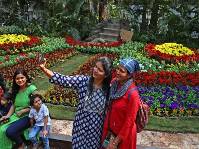 - विविध रंगांच्या फुलांबरोबर सेल्फी घेताना नागरिक