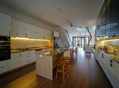 किचनमध्ये देखील छोटे डायनिंग टेबल, मध्ये व एका बाजुला किचन ओटा आहे. त्यापुढे वरच्या मजल्यावर जाण्यासाठी पायऱ्या आहेत.