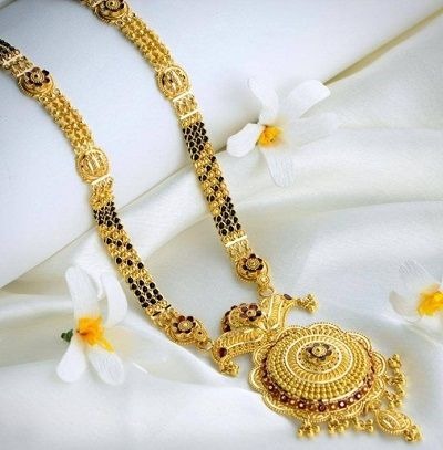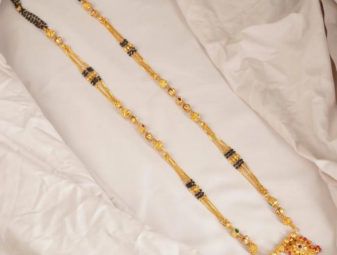 १ ग्रॅम सोन्याचे मंगळसूत्र (One Gram Gold Mangalsutra) हे खरे नसून ते गोल्ड प्लेटेड किंवा १ ग्रॅम गोल्ड फॉर्मिंग प्रकारचे दागिने असतात. हे मंगळसूत्र दिसायला अगदी जड आणि मोठ्या सोन्याच्या मंगळसुत्रासारखे दिसतात पण त्यांची किंमत खूपच कमी असते. (Latest One Gram Gold Mangalsutra Designs)