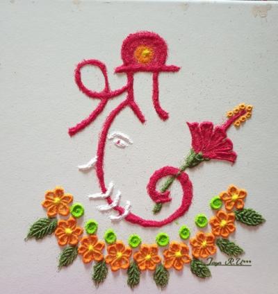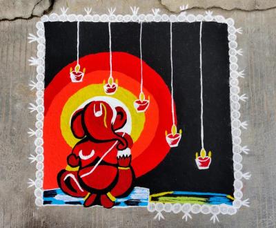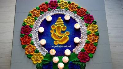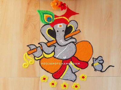 गणपतीच्या रांगोळीसाठी पिवळा, नारंगी, लाल, हिरवा पांढरा हे रंग वापरू शकता.