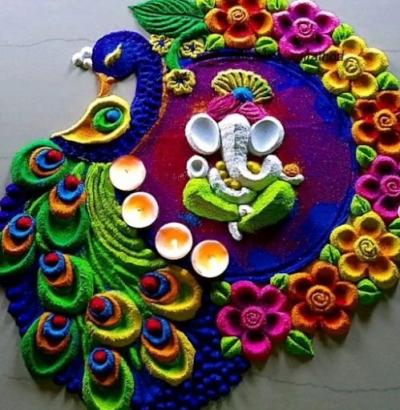 गणपतीच्या रांगोळीत तुम्ही मोरसुद्धा काढू शकता.
