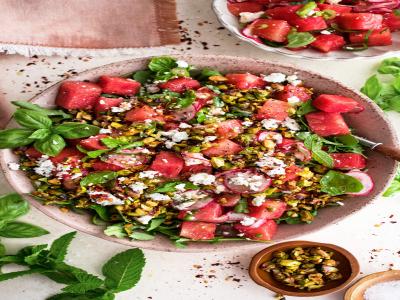 मोड आलेली कडधान्ये, कलिंगड, काकडी, डाळिंबाचे दाणे व डाळिंबाचा रस घालून वरतून पिस्ता घालायचा. या पदार्थाला मेडीटेरेनियन सॅलेड असे म्हणतात. ते फार पौष्टिक मानले जाते.