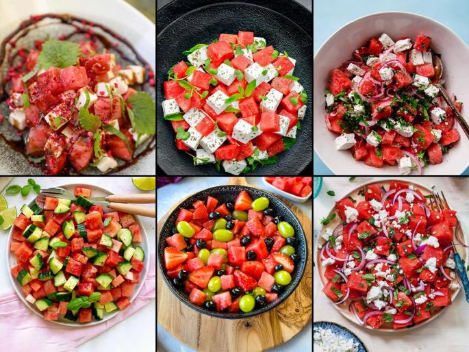 1 / 9उन्हाळ्यामध्ये विविध प्रकारची फळे आपण खातो. काही फळे फार लोकप्रिय आहेत, जसे की कलिंगड. कलिंगड लहान मुलांनाही आवडते आणि मोठ्यांनाही. सगळेच आवडीने खातात.2 / 9मस्त रसरशीत लाल कलिंगड उन्हाळ्याच्या उष्ण दिवसामध्ये खायला मिळाल्यावर मनाला समाधान व पोटाला थंडावा मिळतो. कलिंगड एकतर आपण नुसते खातो किंवा मग ज्यूस करून पितो. कलिंगडाच्या सालाची भाजीही केली जाते.3 / 9कलिंगडाचे कॉम्बिनेशन काही पदार्थांबरोबर फार छान लागते. कलिंगडाची अशी ६ सॅलेड करून पाहा. नक्कीच आवडतील. तसेच पौष्टिकही आहेत. कलिंगडामध्ये दूध घालण्याऐवजी या काही पदार्थांबरोबर कलिंगडाचे मिश्रण करा.4 / 9कलिंगड चाट कधी खाल्ले आहे का? कलिंगड, टोमॅटो, कोथिंबीर, पुदिना, भाजलेले दाणे, चाट मसाला असे सगळे पदार्थ मिक्स करा. त्यावर लिंबाचा रस पिळा.5 / 9कलिंगड व काकडी दोन्ही पदार्थ थंडावा देणारे आहेत. कलिंगडाचे काप करा, त्यामध्ये बारीक चिरलेली काकडी घाला. त्यावर मीठ टाका. लाल तिखट टाका. आणि मिक्स करून मस्त मज्जा घेत खा.6 / 9वेस्टर्न पाककलेत फळे व चीज हे कॉम्बिनेशन फेमस आहे. चीज पायनॅपल जसे लोकप्रिय आहे, तसेच कलिंगड व फेटा चीजचे सॅलेडही लोक आवडीने खातात. त्यावर ओरेगॅनो टाका, तसेच मीठ, चाट मसाला टाका.7 / 9जसे चीजबरोबर कलिंगडाचे कॉम्बिनेशन केले जाते, तसेच पनीरबरोबरही केले जाते. मोठ्या हॉटेल्समध्ये असे पदार्थ फार महाग विकले जातात.8 / 9मोड आलेली कडधान्ये, कलिंगड, काकडी, डाळिंबाचे दाणे व डाळिंबाचा रस घालून वरतून पिस्ता घालायचा. या पदार्थाला मेडीटेरेनियन सॅलेड असे म्हणतात. ते फार पौष्टिक मानले जाते.9 / 9फ्रुट सॅलेड तर तुम्ही नक्कीच खाल्ले असेल. आवडीची सगळी फळे मिक्स करा. कलिंगड, केळे, द्राक्ष, सफरचंद अशी सगळी फळे एकत्र करून हे सॅलेड करता येते.