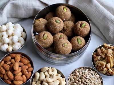 तुमच्या आवडीनुसार डाळी भाजून त्याच बारीक पीठ करून घ्या. या पिठामध्ये ड्रायफ्रुटस, भाजलेले मखाणे बारीक चुरा करून घालावे. हे सगळे एकत्रित करून तुपात ५ ते ८ मिनिटे भाजून घ्या. पीठ थंड झाल्यानंतर हाताला तूप लावून त्याचे गोल लाडू बनवून घ्या.