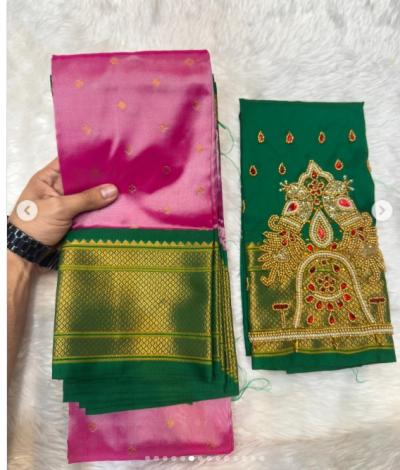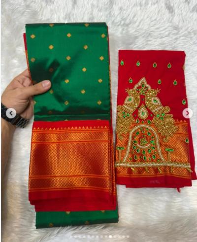 पारंपारीक दागिने कपाळावर चंद्रकोर आणि हे डबल पिकॉक आरी वर्क ब्लाऊज घालून तुम्हाला कोणत्याही मंगल कार्यात एखाद्या राणीसारखे मिरवता येईल.