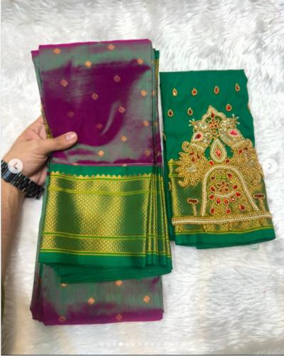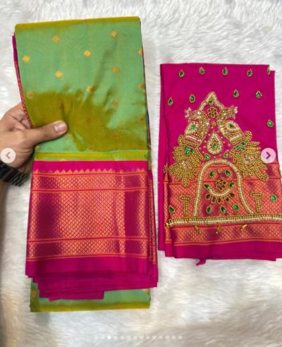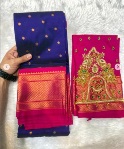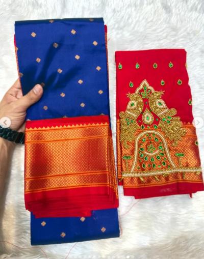 या पैठणीला अधुनिक आणि रॉयल लूक देण्यासाठी सध्या डबल पिकॉक असलेले आरी वर्क ब्लाऊज अत्यंत लोकप्रिय ठरत आहेत.