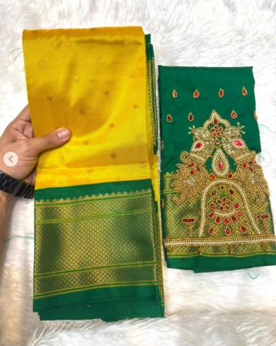ब्लाऊजच्या पाठीवर आणि हातावर सुईच्या साहाय्यानं आरी वर्क केलेले मोरांचे डिझाईन्स अत्यंत उठावदार आणि रिच वाटते.