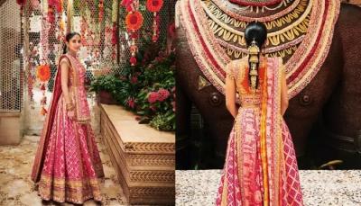 राधिका मर्चंट हिने या सोहळ्यासाठी मनिष मल्होत्रा यांनी डिझाईन केलेला असा सुंदर बांधणीचा घागरा घातला होता.