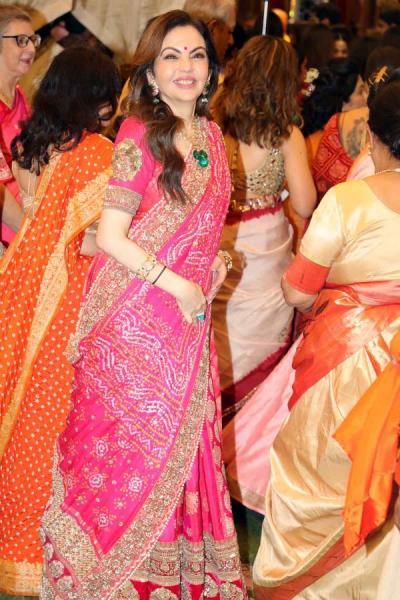 तर नीता अंबानी यांचे सौंदर्य गुलाबी रंगाच्या बांधणी साडीमध्ये खुलून आले होते.