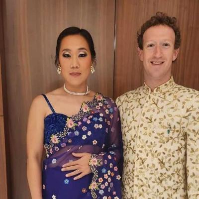 मार्क जुकरबर्ग यांची पत्नी प्रिसिला चॅन यांची जांभळ्या रंगाची फ्लोरल प्रिंटची साडी अतिशय देखणी होती.