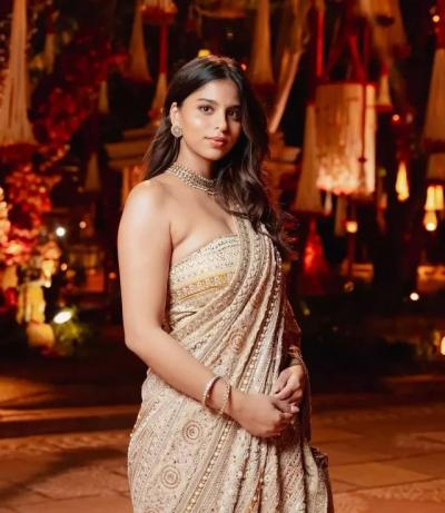 शाहरुख खानची लेक सुहाना खान हिनेदेखील पिवळसर छटा असणारी साडी नेसली होती. तिच्या साडीवर भरगच्च मोती, मिरर आणि एम्ब्रॉयडरी केलेलं होतं. या साडीवर ट्यूब ब्लाऊज घातलेल्या सुहानाचा लूक आकर्षक ठरला.