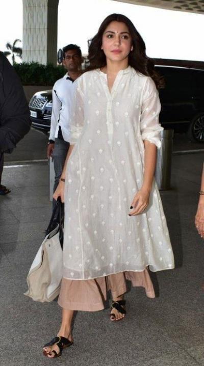 अनुष्काने नुकताच एक पांढर्या रंगाचा कॉटन कुर्ता घातला होता, ज्यावर रंगीबेरंगी फुलांची एम्ब्रॉयडरी होती. त्याला मॅन्डरिन कॉलर आणि लेझची किनार होती. हा लूक कोणत्याही साध्या फंक्शनसाठी किंवा ऑफिससाठी बेस्ट आहे.