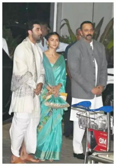 आलिया भटने (Alia Bhat) सुंदर आकाशी रंगाची साडी नेसली असून उजव्या खांद्यावरून तशाच रंगाची शाल तिने घेतली. तर रणबीर कपूरने (Ranbir Kapoor) धोती आणि कुर्ता आणि त्यावर शेला असा सुंदर एथनिक लूक केला होता.