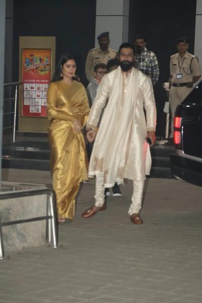 कतरिना कैफ (Katrina Kaif) आणि विकी कौशल या दाम्पत्यानेही मोठ्या उत्साहात अयोध्येला हजेरी लावली आहे. गोल्डन रंगाच्या चमकदार साडीत कतरिना सुंदर दिसत होती.