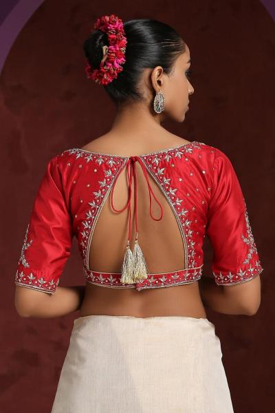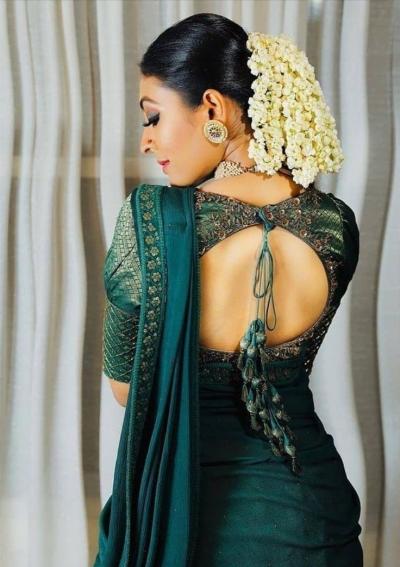 मागच्या गळ्याला कोल्ड कट देऊन त्यावर साडीच्या रंगाचे लटकन किंवा गोंडे लावल्यानं ब्लाऊजला वजनदार लूक मिळतो.