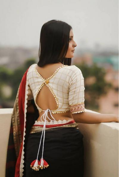 पारंपारीक साडी असेल तर मागच्या बाजूला मटका गळा शिवून त्याला सिल्व्हर किंवा गोल्डन घुंगरू लावल्यास लूक खुलून येईल.