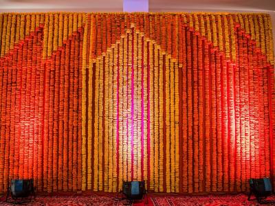 बॅकड्रॉपचा हा एक सोपा प्रकार पाहा. यामध्ये एक प्लेन कपडा मागच्या बाजूने लावून समोरच्या बाजूने फक्त रेडिमेड मिळणाऱ्या फुलांच्या माळा लावल्या आहेत.