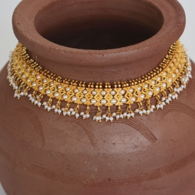 अशा पद्धतीचा मोत्यांचा वेल लावलेल्या चिंचपेटी गळ्यातल्यांना सध्या खूप मागणी आहे. कारण हा प्रकार अतिशय वेगळा आहे.