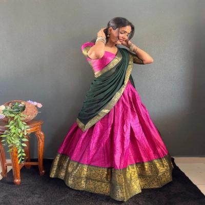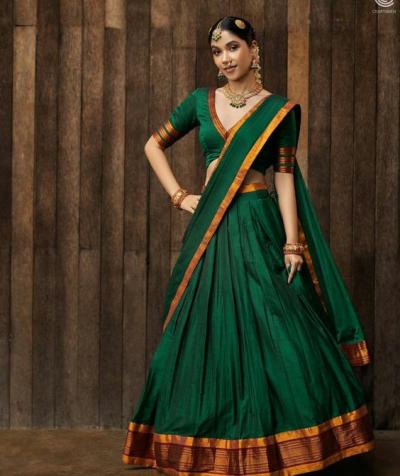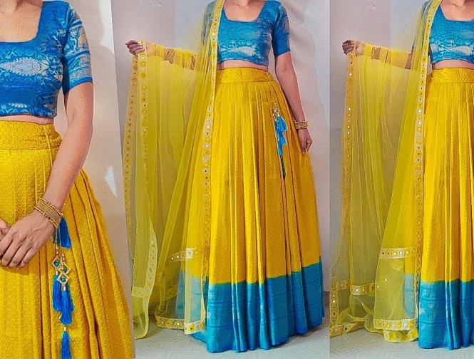 साऊथ इंडियन प्रकारचे ड्रेस आवडत असतील तर मोठ्या काठांची एखादी साडी घ्या आणि त्यापासून असा आकर्षक लेहेंगा शिवून घ्या.