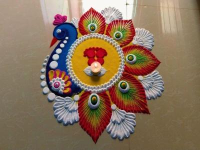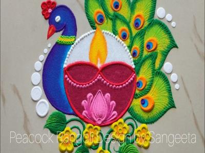 आपण आधी दिवा काढून, त्याच्याभोवतीने मोराची सुंदर रांगोळी डिझाईन काढू शकता. शिवाय लहान फुलंही काढू शकता. त्याच्या जवळ दिवे लावा. रांगोळी आकर्षक दिसेल.