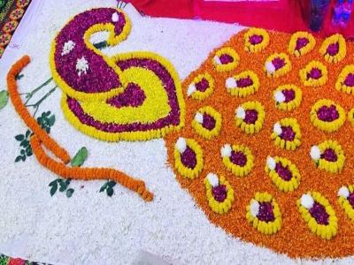 जर रांगोळी आपल्यालाकडे उपलब्ध नसेल तर, आपण फुलांचा वापर करूनही सुंदर मोराची रांगोळी डिझाईन काढू शकता.