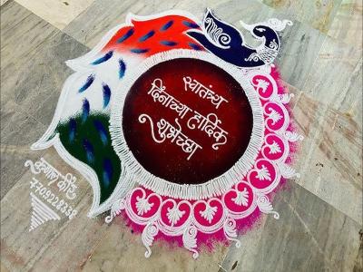 जर आपल्याला युनिक आणि मोठी रांगोळी डिझाईन काढायची असेल तर, सर्वात आधी, गोलाकारभोवती लहान डिझाईन काढा. मध्यभागी दिवाळीच्या शुभेच्छा लिहा. नंतर मोराची डिझाईन काढा.