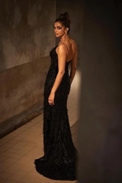 ब्लॅक फेदर बॅकलेस गाऊनमध्ये दीपिका खूपच सुंदर दिसत आहे. पोनी मेसी बन, लांब कानातले, डायमंड रिंग आणि स्मोकी आयसह अभिनेत्रीने तिचा खुलवला .