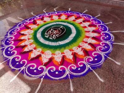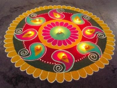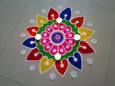 एकाच रांगोळी भरपूर रंगाचा वापर करून तुम्ही कलरफूल रांगोळी काढू शकता. एक ठिपका काढून माचिसच्या काडीच्या साहाय्याने त्याला आकार देऊ शकता.