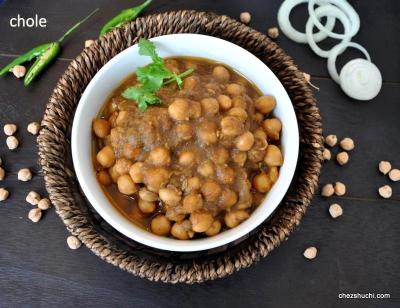 चणे स्वच्छ धुवून घ्या. एका भांड्यात गरम पाणी घ्या आणि त्यात चणे घाला. चणे गरम पाणी शोषून घेतात आणि लवकर फुलतात. १.५ ते २ तासांमध्ये चणे फुगून तयार होतील. त्यानंतर ते कुकरमध्ये शिजवा.
